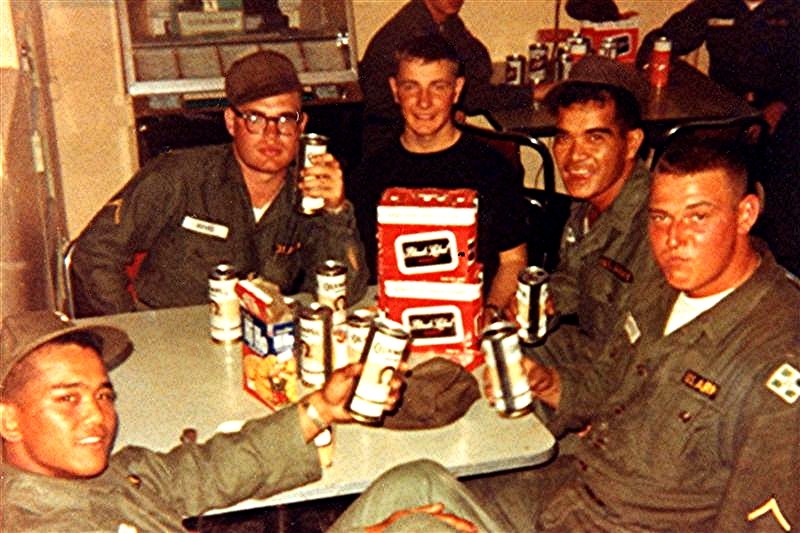 Kicking back having a brewski at the PX, Ft. Lewis, May 1966, C/3/22 4th Plt. From L to R.
